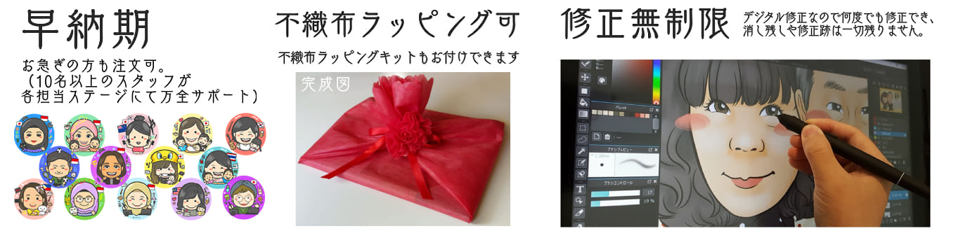 似顔絵師ぴんくぶたの似顔絵は 和紙印刷・不織布ラッピング・修正無制限